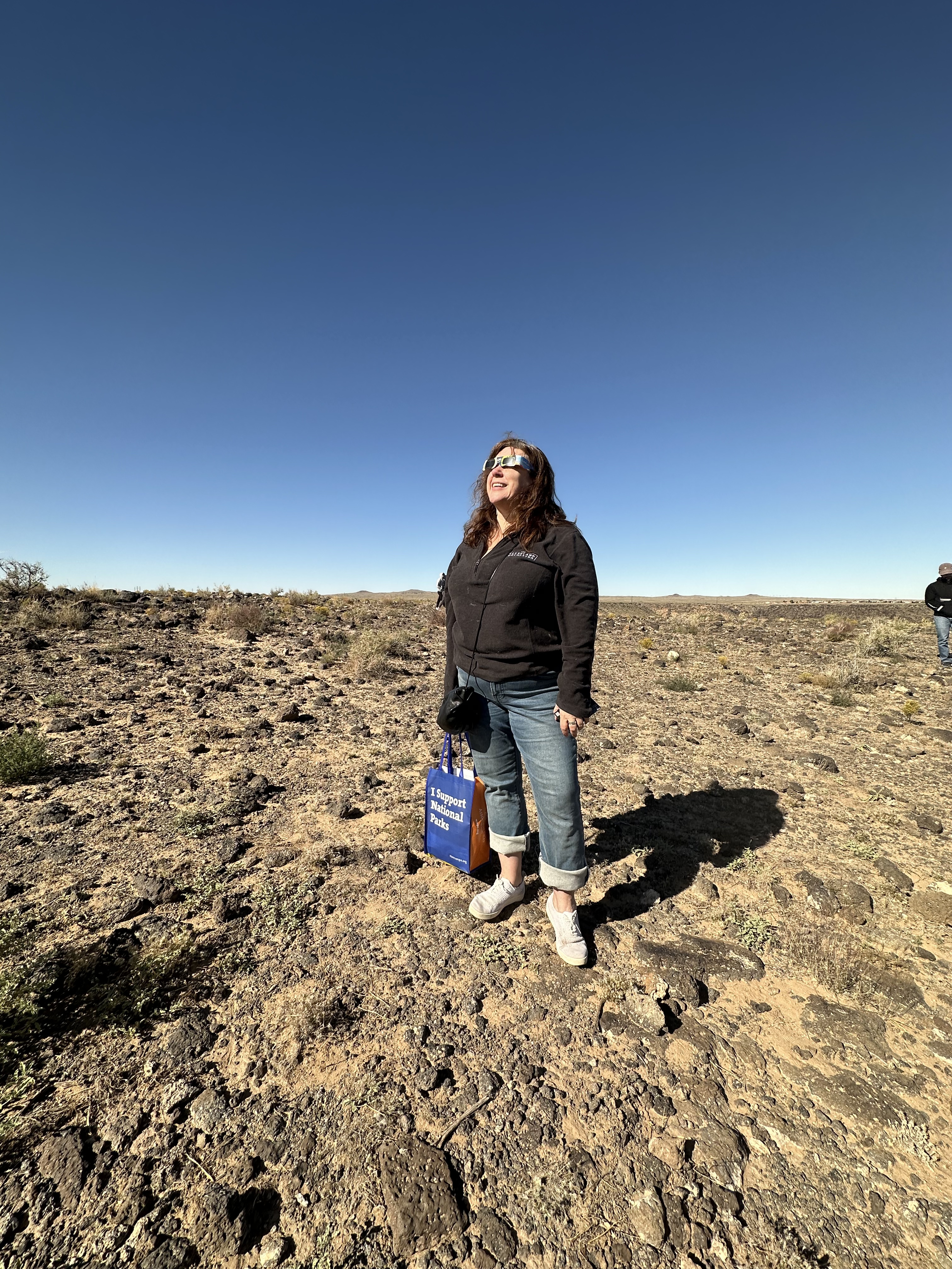 From there, it was time to get serious about the eclipse, or as they call it in New Mexico, the E-clipse. Since all of Abuquerque was in the path, there were some good choices, but ultimately I headed for the Petroglyph National Monument visitor center (I couldn’t get to the trails, but I’ve seen lots of petroglyphs over the years and around the globe), where I spoke with park rangers and a wonderful collection of of folks from near and far. From there, I walked along a mysterious path (where folks had set up telescopes), to the lava field of the “Three Sisters” volcanos. Though I hadn’t intended to, I hiked to the top of the volcanos, found a nice piece of lava on which to plant myself and watched through the various glasses the rangers were handing out. The field was populated with good natured and friendly groups of eclipse watchers, some with impressive cameras – one nice man from Miami with a giant set up, let us watch through his lens and took email addresses promising to send us all his photos. But most folks (me included) were trying desperately to put sun protective glasses over their camera lens to do the best they could. Just as the total eclipse occurred and the famed “ring of fire” appeared, one clever group turned on Johnny Cash and everyone gathered joined in a giant singalong and I teared up at the beauty of our shared experience.