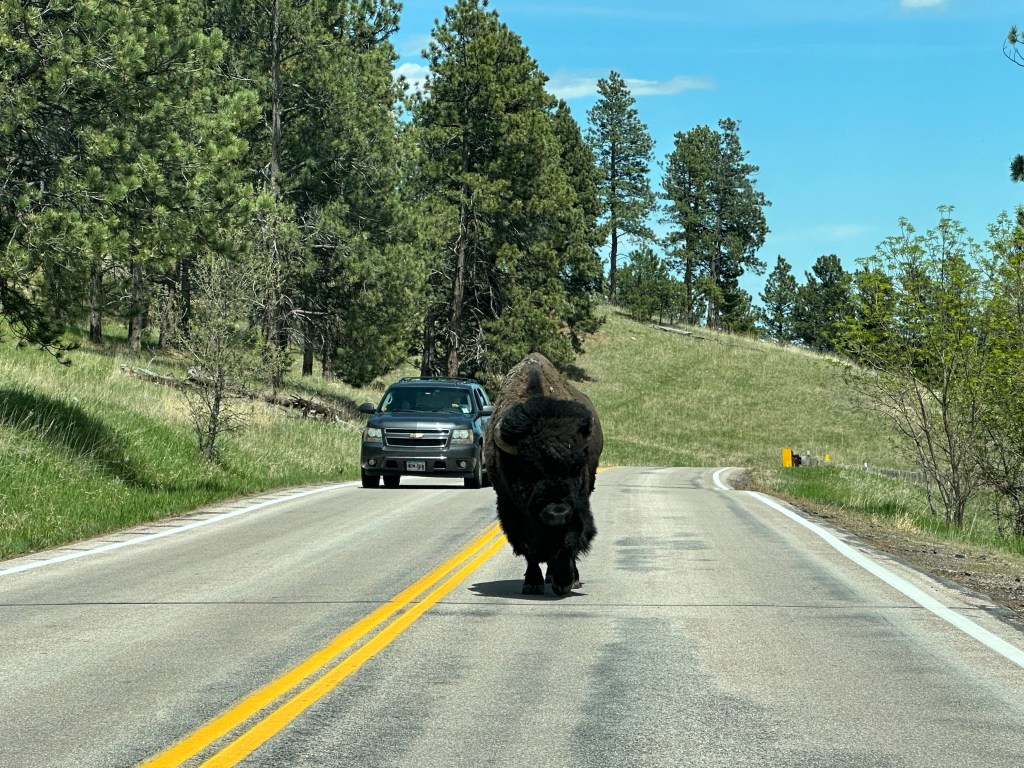 The Needles Highway from Crazy Horse through Custer State Park was a spectacular winding road full of switch backs and treacherous drops. Custer State Park was glorious and, after a twisty drive and some turn offs to hike around beautiful lakes and along lovely paths, I suddenly found my car surrounded by bison. I was warned of course, there are signs everywhere saying stay in your car, and don’t approach, but there were none and there were none and there were none and then all of a sudden they were everywhere and it was amazing. As I was leaving the park, one popped up out of nowhere on the road ambling slowly towards my car, taking his sweet time. I could not have written it better.