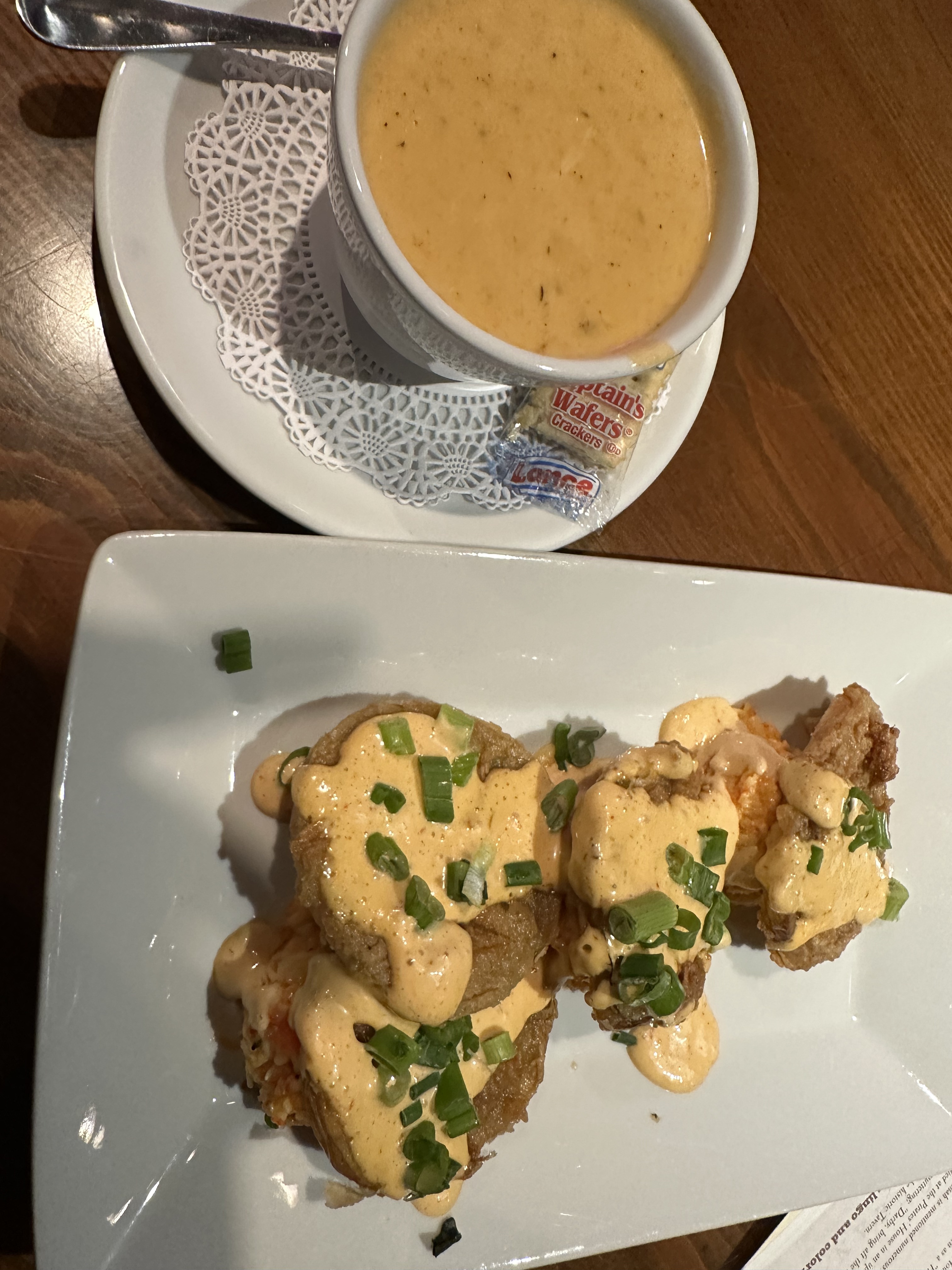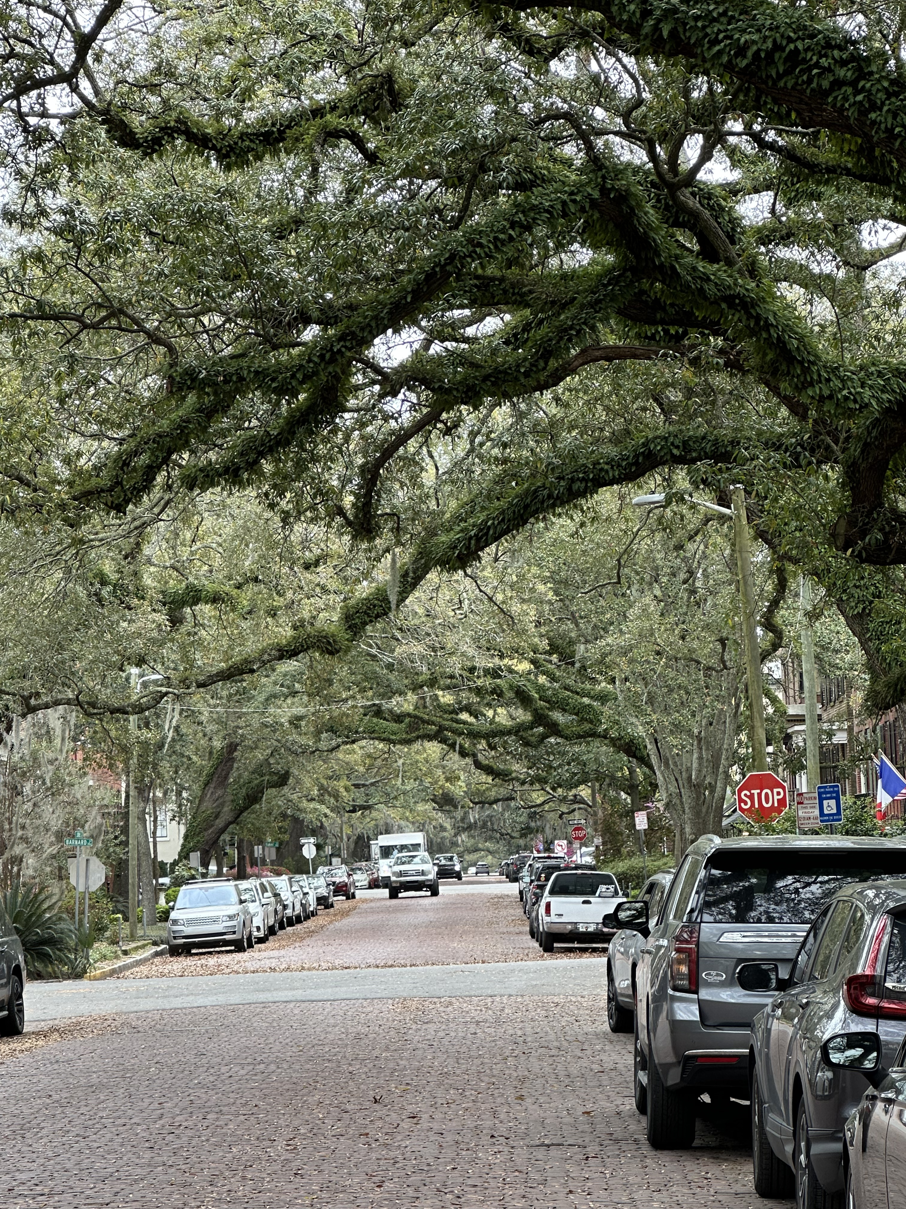 *** BONUS – A couple months ago, I went to Savannah, Georgia with my friend Gene. I got there the night before he arrived, so I figured I’d eat the meal I cooked for Georgia. Looking back, I kind of cheated and made pimento cheese, which I served with fried green tomatoes. At the very touristy Pirates Cove retaurant, which was near the hotel and low effort, I ordered fabulous crab soup, fried green tomatoes, and pimento cheese – turns out that is how one is meant to serve the FGTs in Georgia. I enjoyed them while the charming bartender regaled me with stories of Savannah’s haunted history. Two things I love – a charming bartender and haunted history, though, as mentioned above, ghosts aren’t real. And bartenders lose their charm, so but for the night it was fabulous. Also fabulous – Savannah. What a beautiful city.