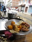 We both got to the “I must eat lunch” place at the same time. Looking around for a taxi to take us back to the restaurant where we’d had our earlier beverage, we spied a place selling Nepalese momos, a dumpling. we got two vegetable dumplings each, filled with a spicy chickpea paste, and something that looked like a fried onion ring, but was actually a doughnut like pastry with a slightly crunchy texture from sugar crystals.