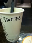 The woman behind the counter called out “two tall lattes,” not even attempting to pronounce “Spartifus” as the guy taking our orders had written on the cup, and we were crushed.