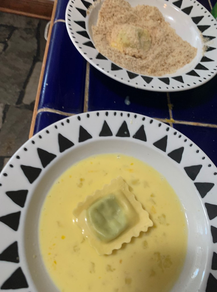 Fried ravioli is very easy to make. You start with prepared ravioli – I used spinach and cheese – and you batter and fry it, and voila. I’m very good at battering and frying through this project. There are a lot of fried options out there. I used an egg with a couple tablespoons of milk for the first dip and a mix of breadcrumbs and Italian spice for the second dip.