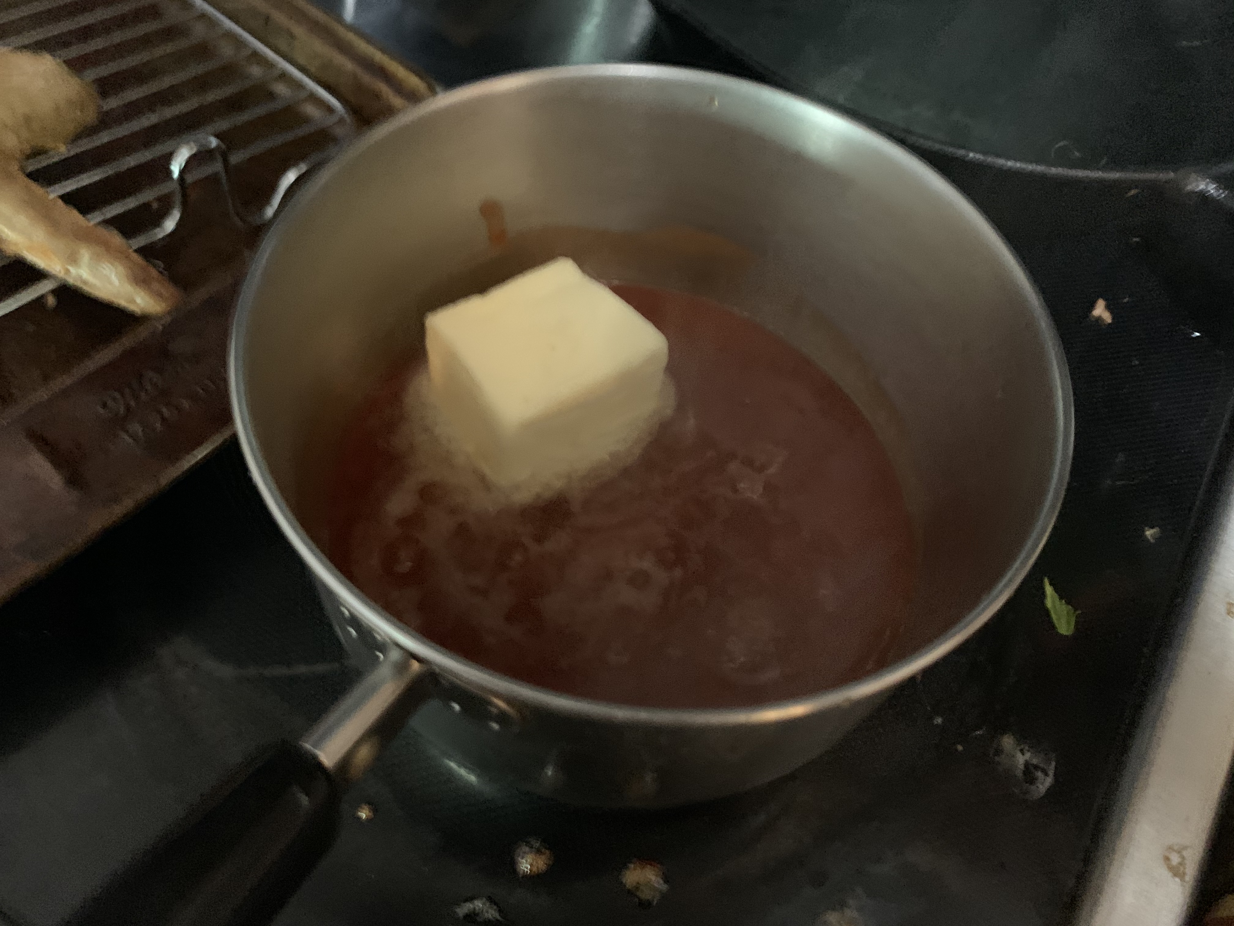 Pretty much every Buffalo wing recipe is the same. You crisp the wings in a 400 degree oven for about 50 minutes or so. While that’s cooking you make the sauce – a quarter cup Frank’s Red Hot, 2 tablespoons honey, and 4 tablespoons butter. I didn’t have quite enough honey, but it worked all the same. When the chicken is done you throw it in a bowl with the sauce til it is well coated and put it under a low broiler for about 3-5 minutes or until the sauce is carmelized. Serve it with carrot and celery sticks and some ranch dressing.
