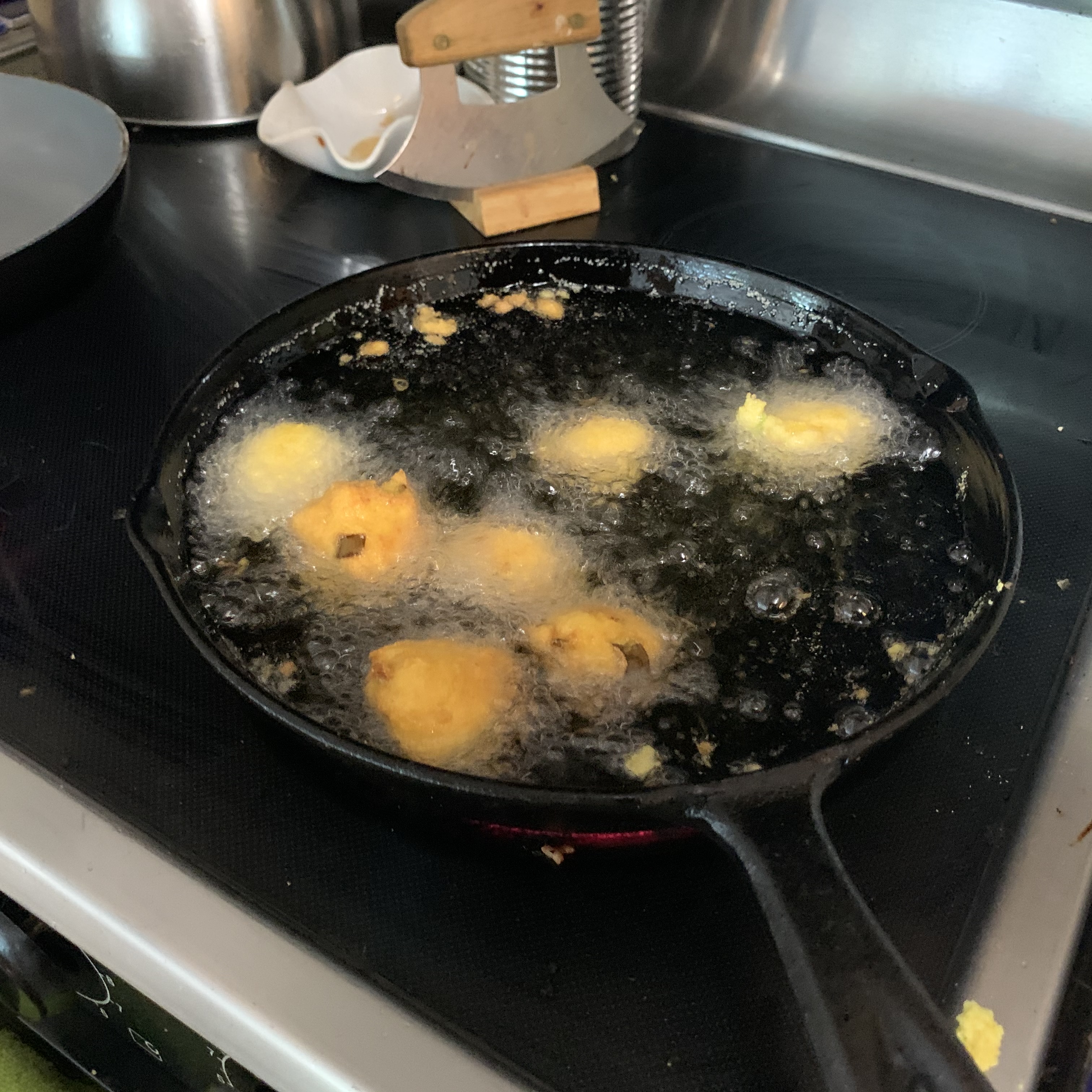 Before you serve it though, you need a side dish, and with barbecue, you need hush puppies, which are super easy to make. 2 cups of corn meal, 3tablespoons flour, one cup milk one egg, and a whole lot of chopped green onion. I’m terrified of deep frying things, but there’s no getting around it for these. You drop them in to hot oil one spoonful at a time and roll them around until they’re golden brown.