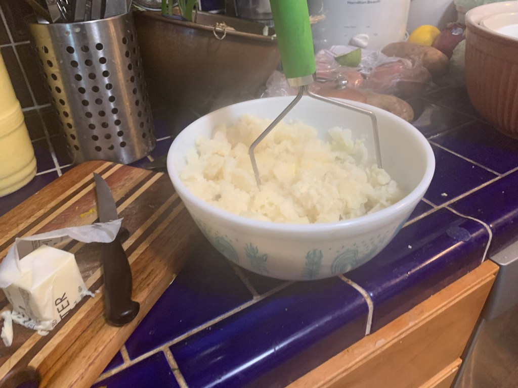 The potatoes should be very smooth. When they are you chill them for an hour to a day. I chilled all but a bowl full of the fully potato perfection I had created, which, with some pepper and horseradish (trust me), became lunch.