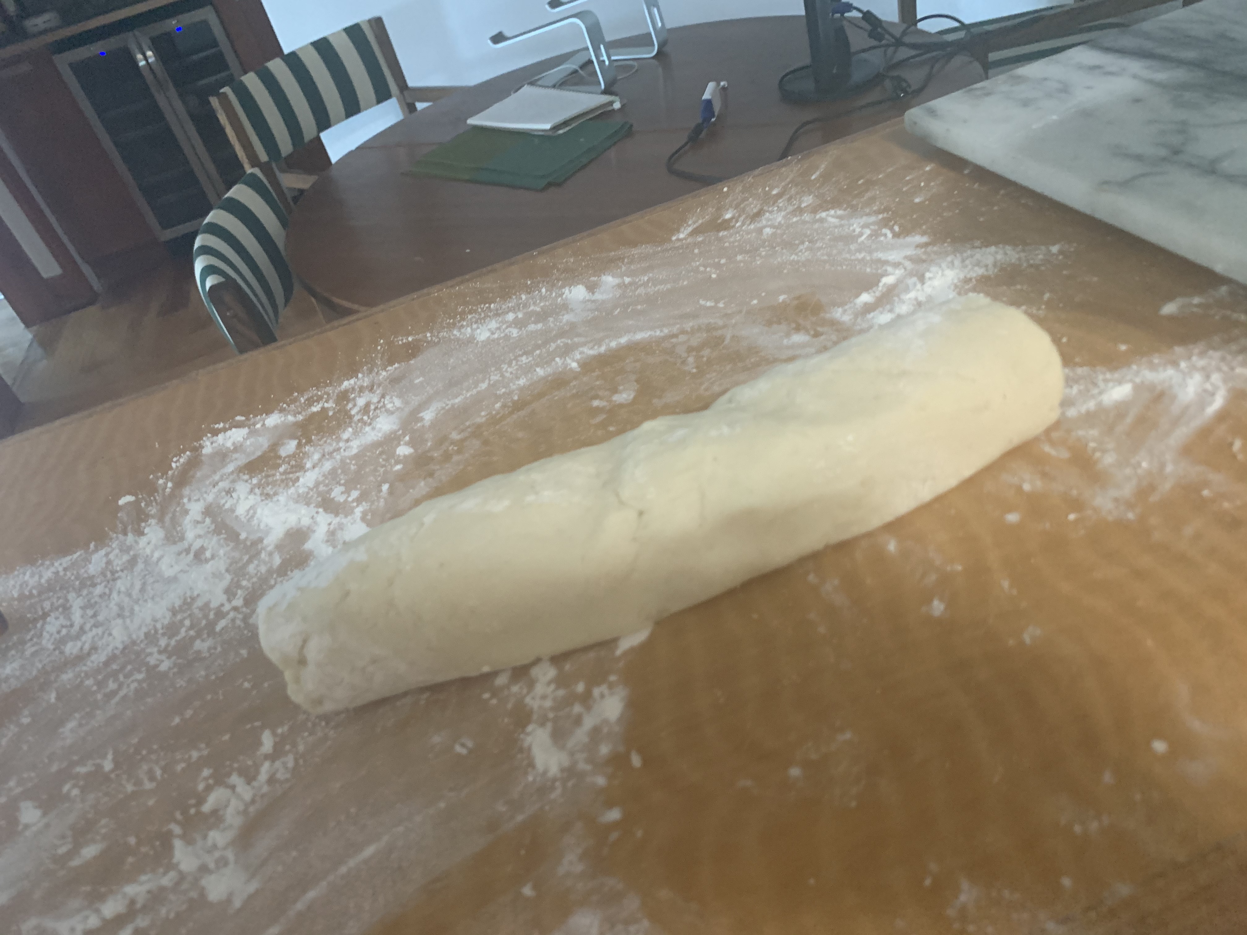 When you’re ready, you add a cup and a half or so of flour to mix, roll it into a log and cut that into twelve equal pieces. (Equal is relative for me). Then you flatten each piece into a very thin disk.