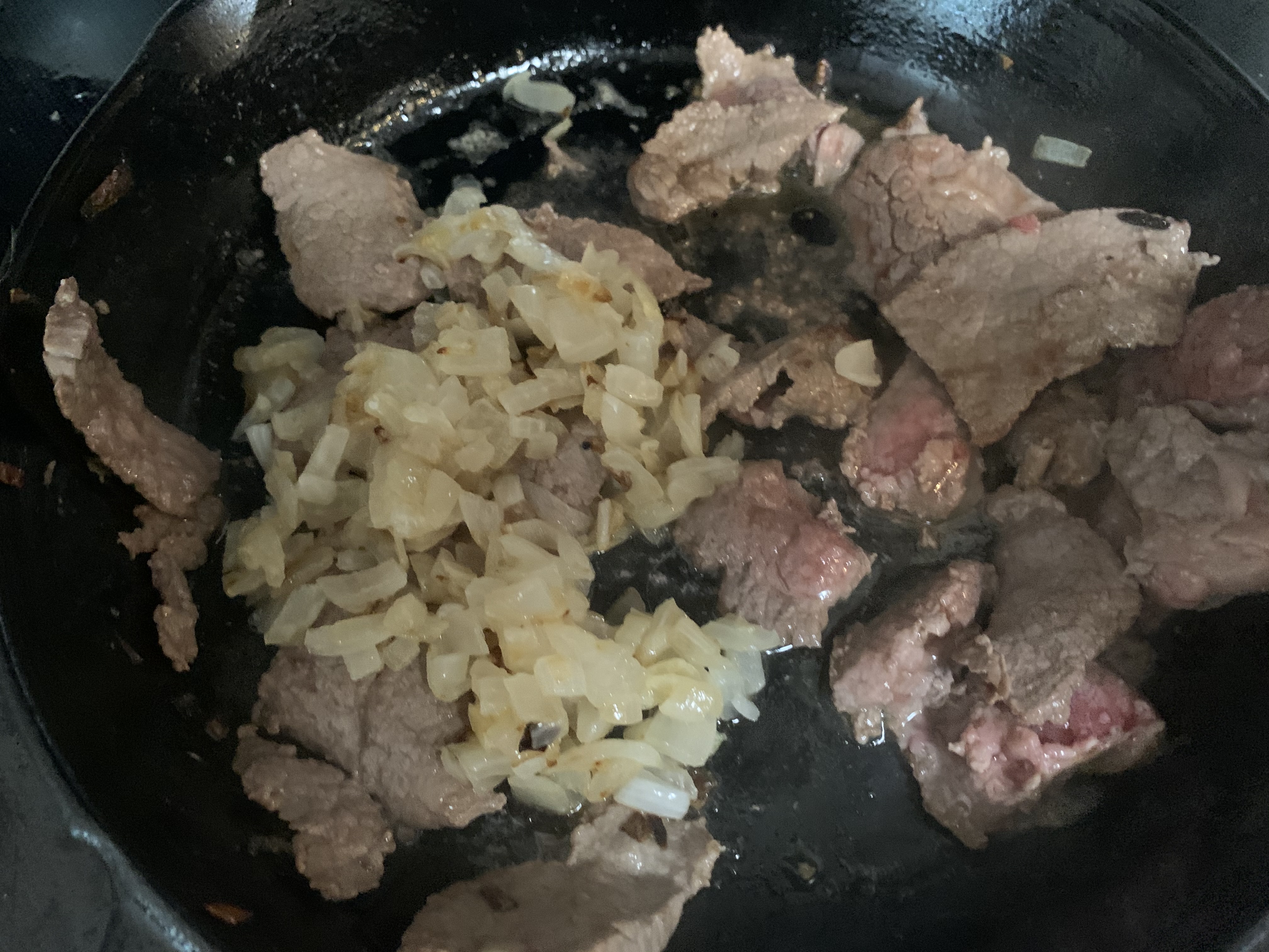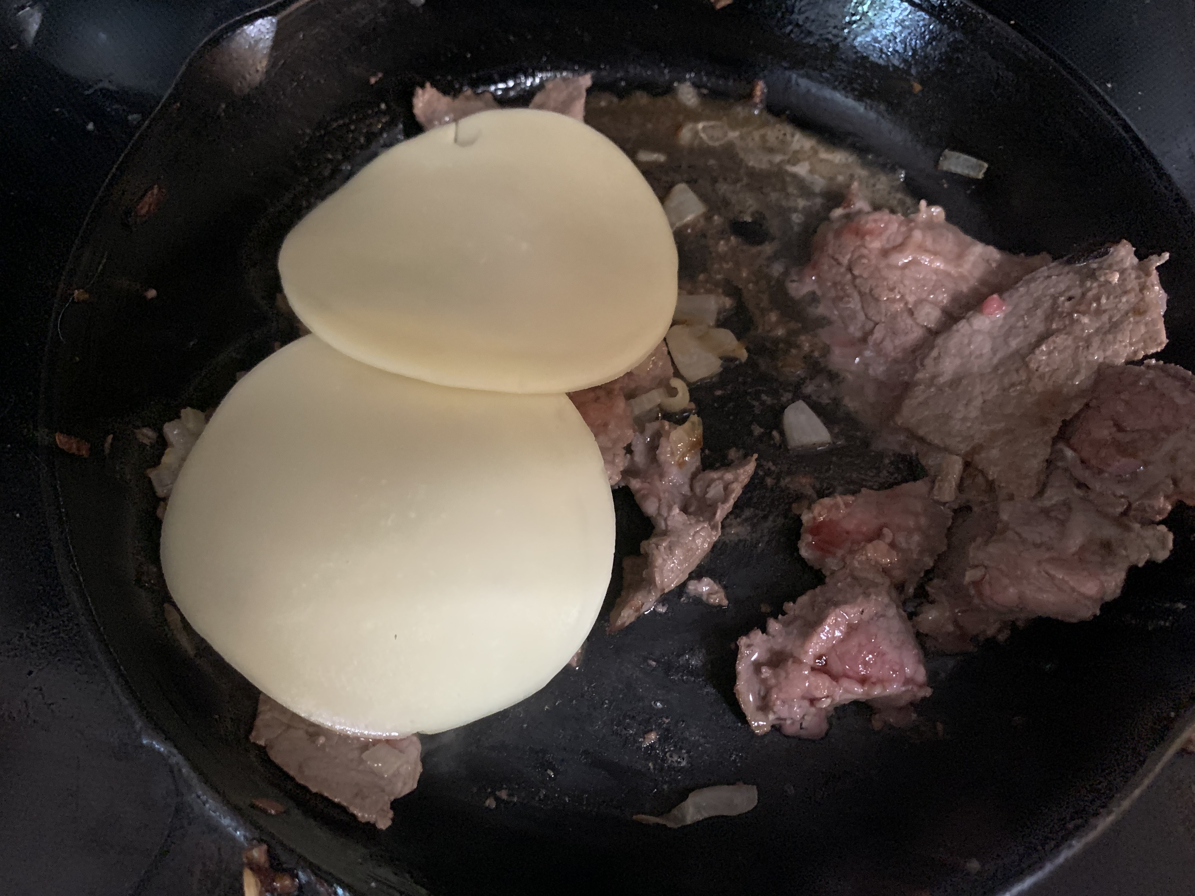 Next saute chopped onions until they are very soft. Set them aside and saute thinly sliced steak in the same pan. When the steak is cooked through add back the onions, then portion the steak and onions to fit into the role and add a couple slices of provolone on top.