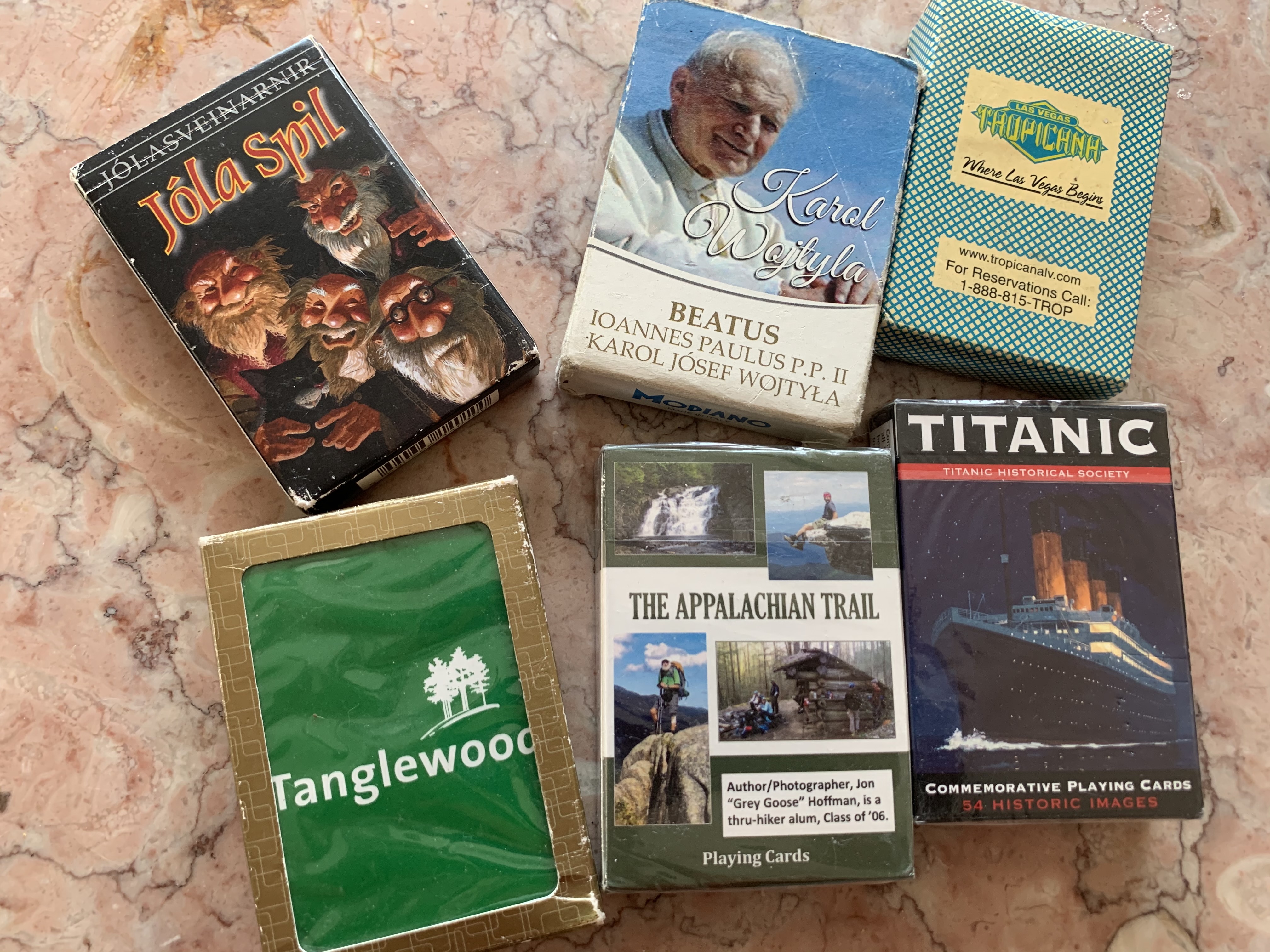 The last time I was in Pennsylvania, I was driving through on the way to Tennessee (you’ll hear about that trip soon). I was with my friend Lynn and her kids and we stopped at a gas station, somewhere in Amish country, for a fill-up. I pretty promptly locked the keys in our rental car. While we waited for the mechanic to come free us, we bought a deck of Pennsylvania cards to kill the time. Along with hot sauce, one of my usual take homes from a trip are souvenir cards – I have some from Iceland, the Vatican, Las Vegas, Tanglewood, the Appalachian Trail, and the Titanic Museum. I have so many others from other trips, but they seem not to have made my move.