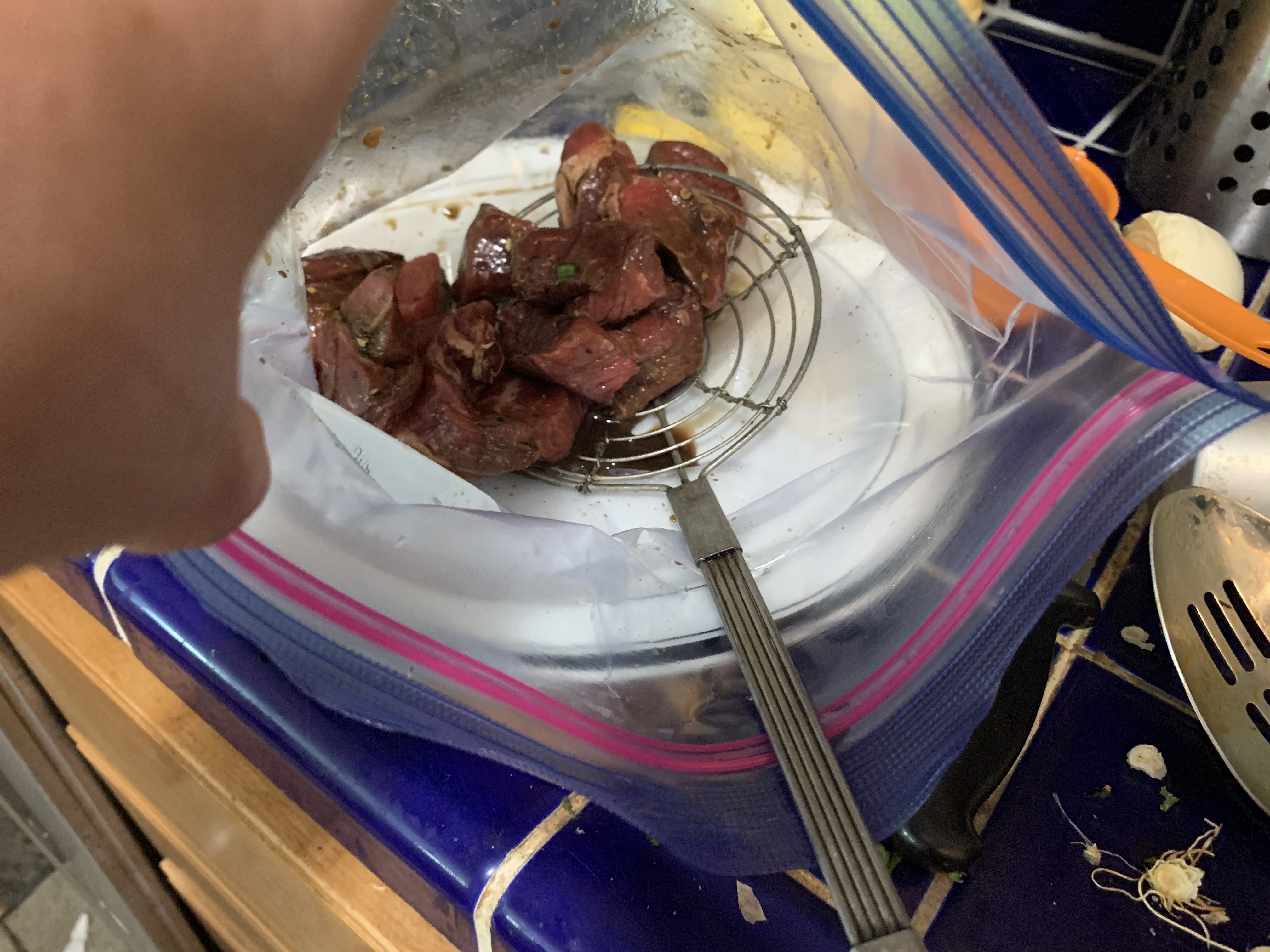 Cube your meat and marinate it in Worcestershire sauce, garlic powder, red pepper flakes, and s&p for at least an hour, but up to 24 hours. Then you deep fry it. I don’t have a deep fryer, so I put a couple inches of oil in a cast iron pan and did my frying there.