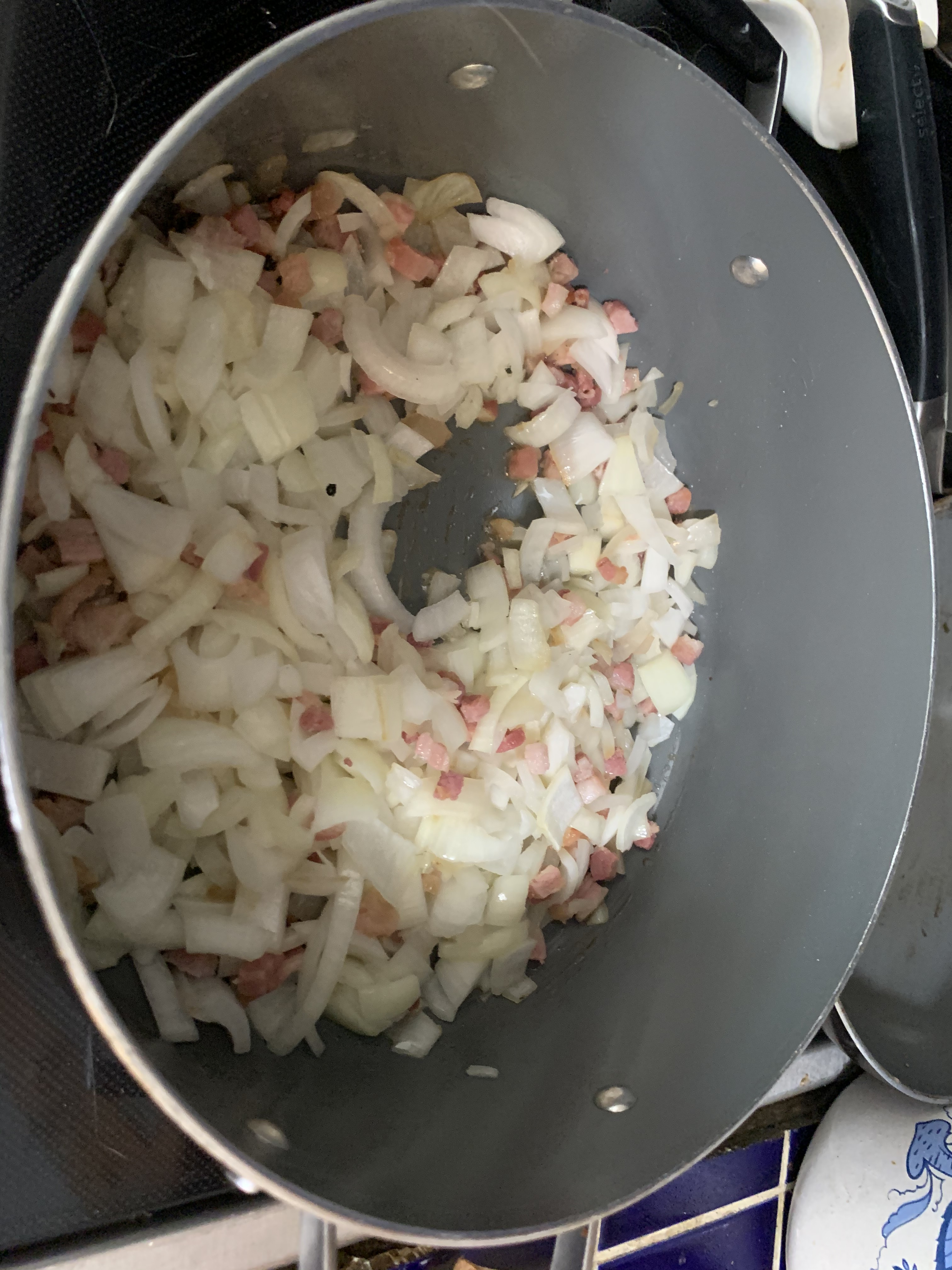Brunswick stew is another easy, but slow creation. First you brown up some onions with some bacon in a big pot. Add in a bag of beans, whatever are local I suppose. I used lima beans, 4 chopped up potatoes, and a can of diced tomatoes. To that you add in a couple raw chicken breasts, bring the whole thing to a boil and then let it simmer for an hour or so.
