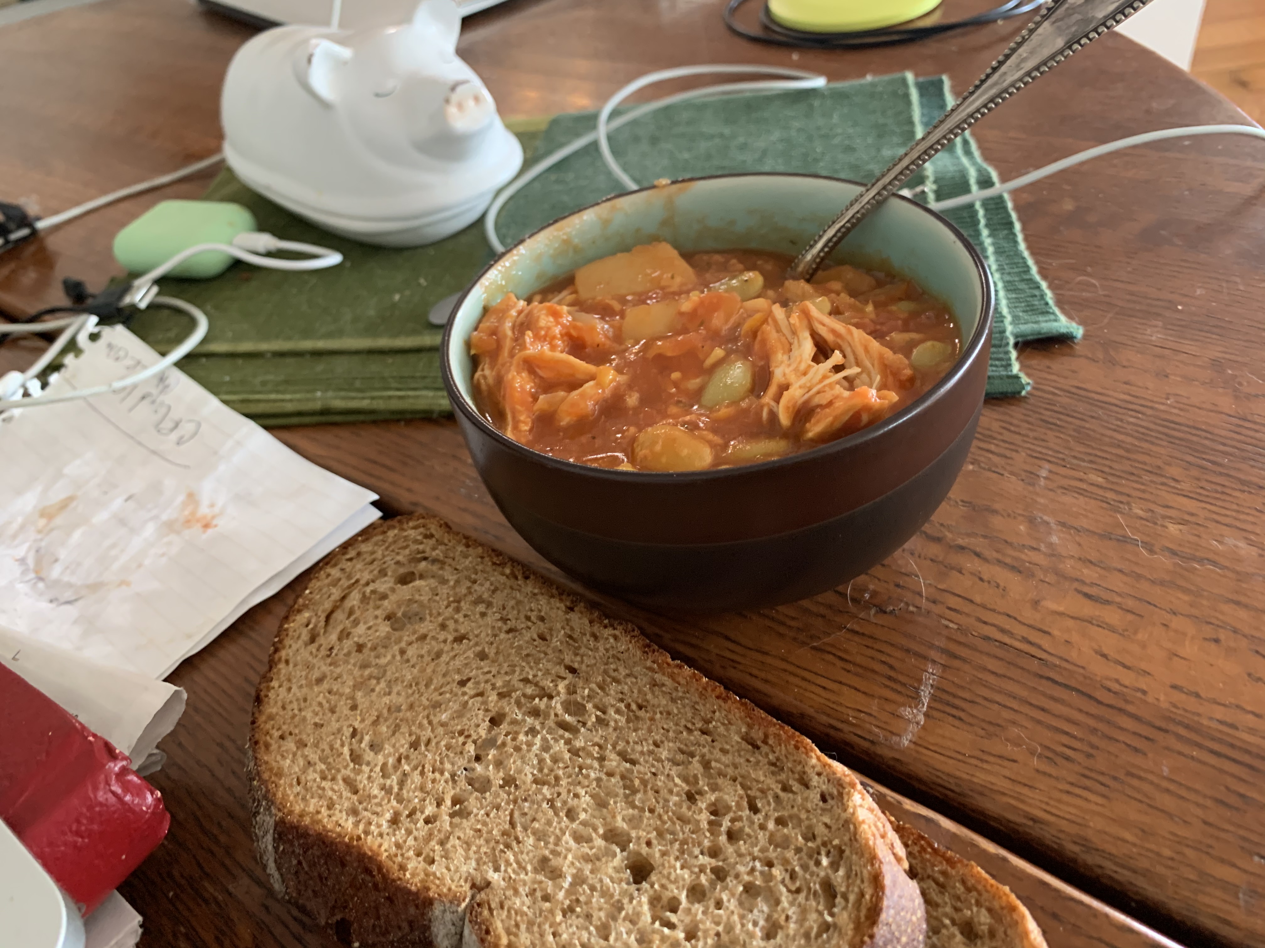 It was good with some brown bread, but it was a little boring. The next day though, when it got to 3 pm before I had a minute to eat anything, the hearty soup was exactly what I needed. I think, like Louisiana gumbo, this would be a perfect thing to have in my freezer for the winter. I just don’t have winters any more.